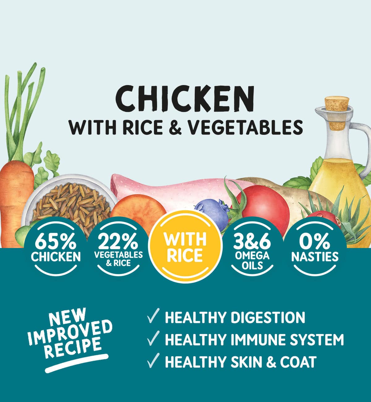Our Chicken with Rice and Vegetables recipe is more advanced, offering a complete meal with 65% Chicken, an excellent source of quality protein with B vitamins, along with 12.5% Brown Rice and 10% Vegetables. These provide highly digestible energy, fibre, and natural nutrients, making this recipe nourishing from head to tail.